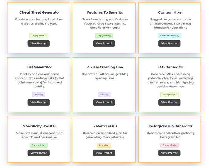✔️ 100+ AI prompts to save content creators hundreds of hours of time and thousands of dollars on freelancers.✔️ Prompts for content creation, ideation, research, strategy, productivity, and more.✔️ Instantly complete tasks that would take hours or even days.✔️ 12 new AI prompts added each month.So you can spend less time creating content and more time on what matters to you.