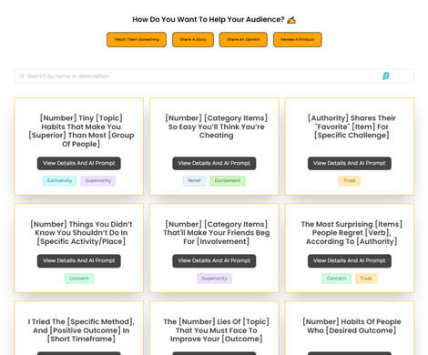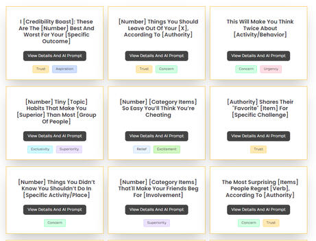 ✅ Based On Headlines Already Proven To Work: Inspired by huge content creators and publications like MrBeast, Condé Nast, Ali Abdaal, and Mark Manson.✅ 40 Templates Added Each Month: So you never run out of high-engagement headlines. Say goodbye to creative block.✅ Filter By Content Type: Headline templates for how-tos, listicles, opinion pieces, product reviews, and more. Quickly filter them so you don’t waste time searching for the type of headline template you need.✅ Tagged By Emotion: Choose headlines based on emotions such as FOMO, relief, empathy, frustration, and more. The best headlines strike some sort of emotion (and some emotions work better than others).