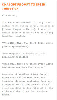✅ Each Template Works In Any Niche: We make sure of it. Just fill in the blanks for your specific piece of content and you’re good to go.✅ ChatGPT Prompts For Content Ideas: Copy and paste them into ChatGPT to instantly turn any of the headline templates into headline ideas for your niche...