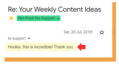 On Saturdays, we'll also send you a weekly "Hook Report":• 4 proven headline templates — hand-picked from the Look At Hooks template database.• Each one personalized and turned into a highly clickable headline for your specific business, niche, and audience.• Specific suggestions on exactly what information to include in each piece of content, tailored to the platforms you create content on.Yep — a personalized weekly content plan courtesy of our custom AI model "Hooksi".And let's just say...people love Hooksi 🙂: